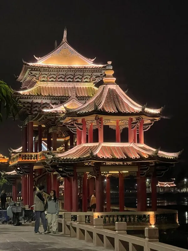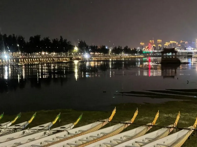 搞定房型後,去龍舟池逛了一下,晚上點燈比較美。晚餐是隨便選了一家小餐廳,口味和台灣很接近,不過薑母鴨是乾燒的,沒有湯可以喝。