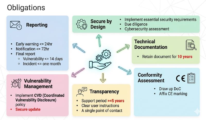 - 製造商需要出DoC(Declaration of Conformity),聲明符合CRA。DoC是法律文件